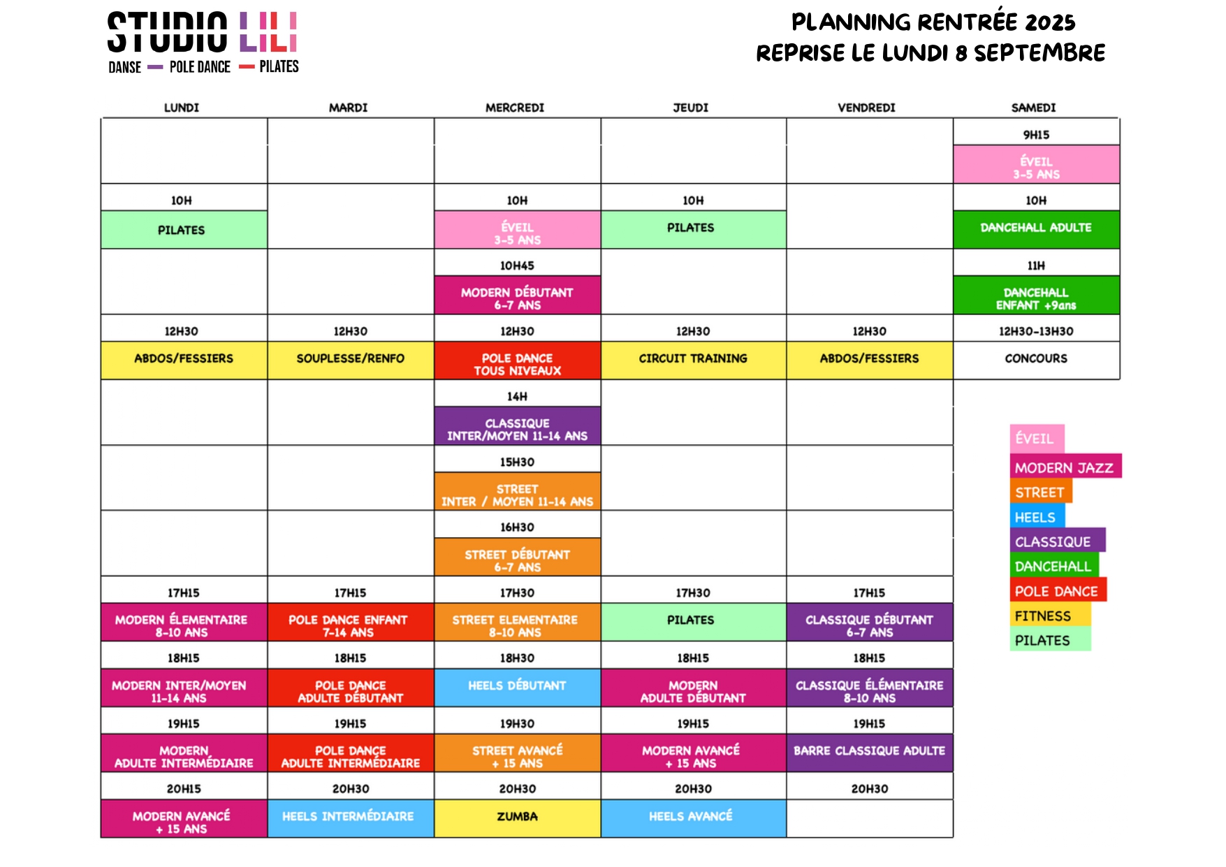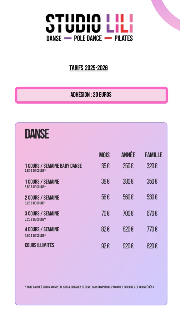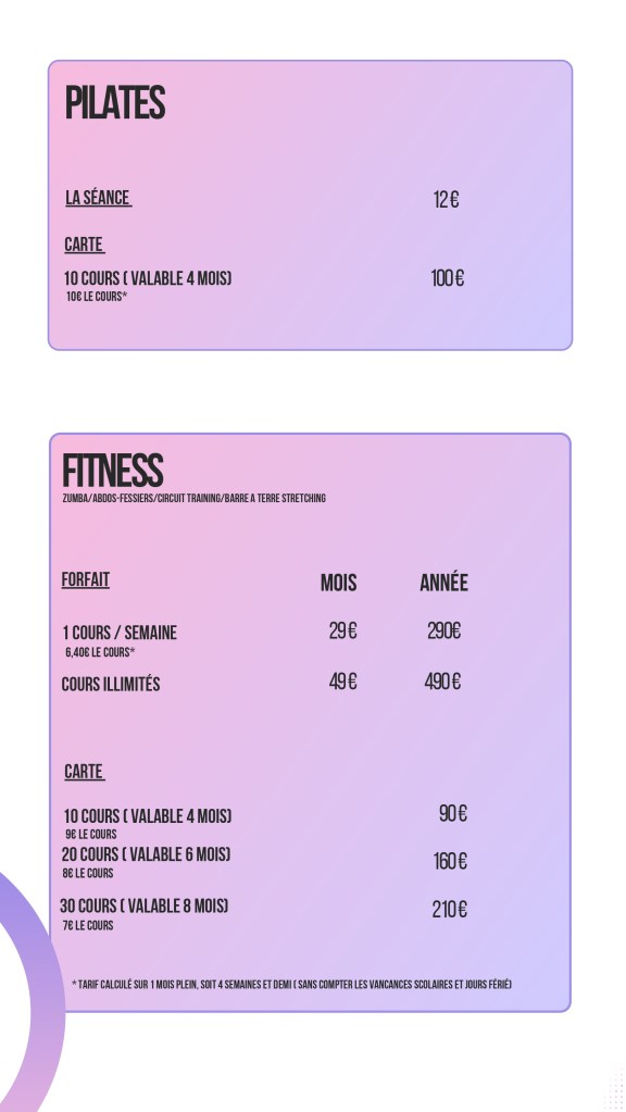 Modern jazz et de Heels, également tous les cours de remise en forme, accompagnera les futurs mariés pour leur chorégraphie d’ouverture de bal et nouveauté cette année le cours duo maman/bébé pour les jeunes parents